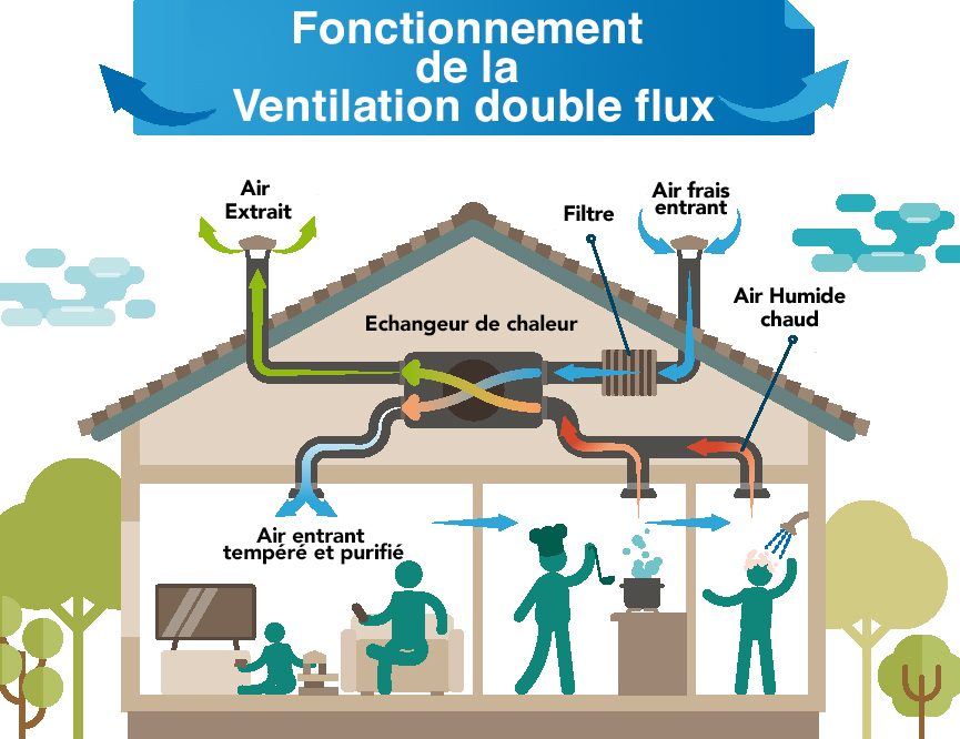 Grâce à un échangeur de chaleur, la chaleur de l’air extrait est récupérée pour préchauffer l’air entrant, limitant ainsi les pertes thermiques. Ce système garantit un renouvellement d’air constant, améliore le confort thermique et réduit les besoins de chauffage.